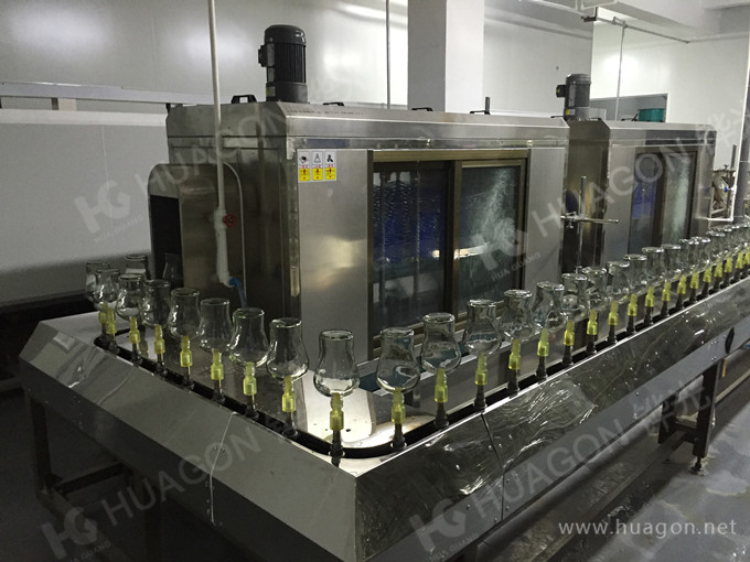 洗瓶:上料-光檢-自動清洗一(清潔劑)-自動清洗二(清水)-風刀除水-熱風除水-烘烤-轉在線料